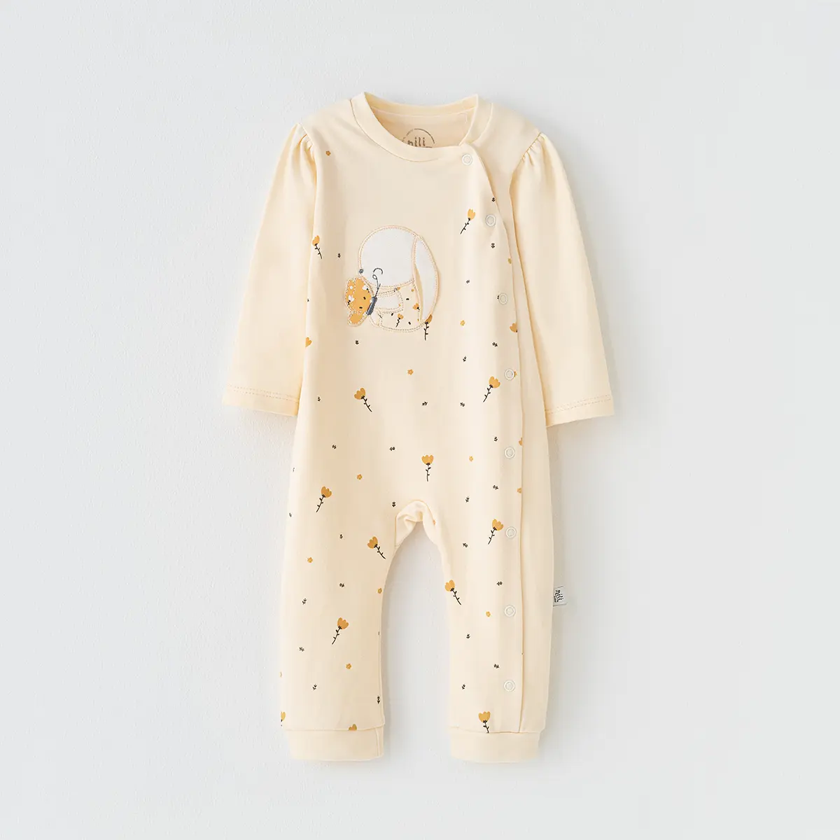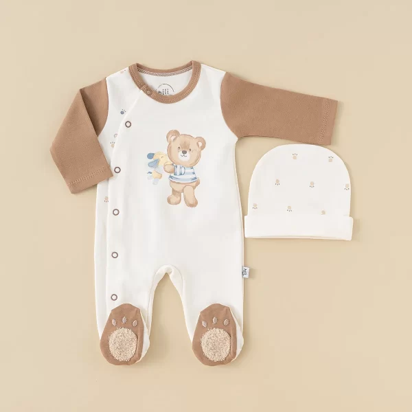 سایز 1 (3 تا 6 ماه): قد کامل 48، قد تا فاق 34، عرض سینه 26.5، قد آستین 17.5