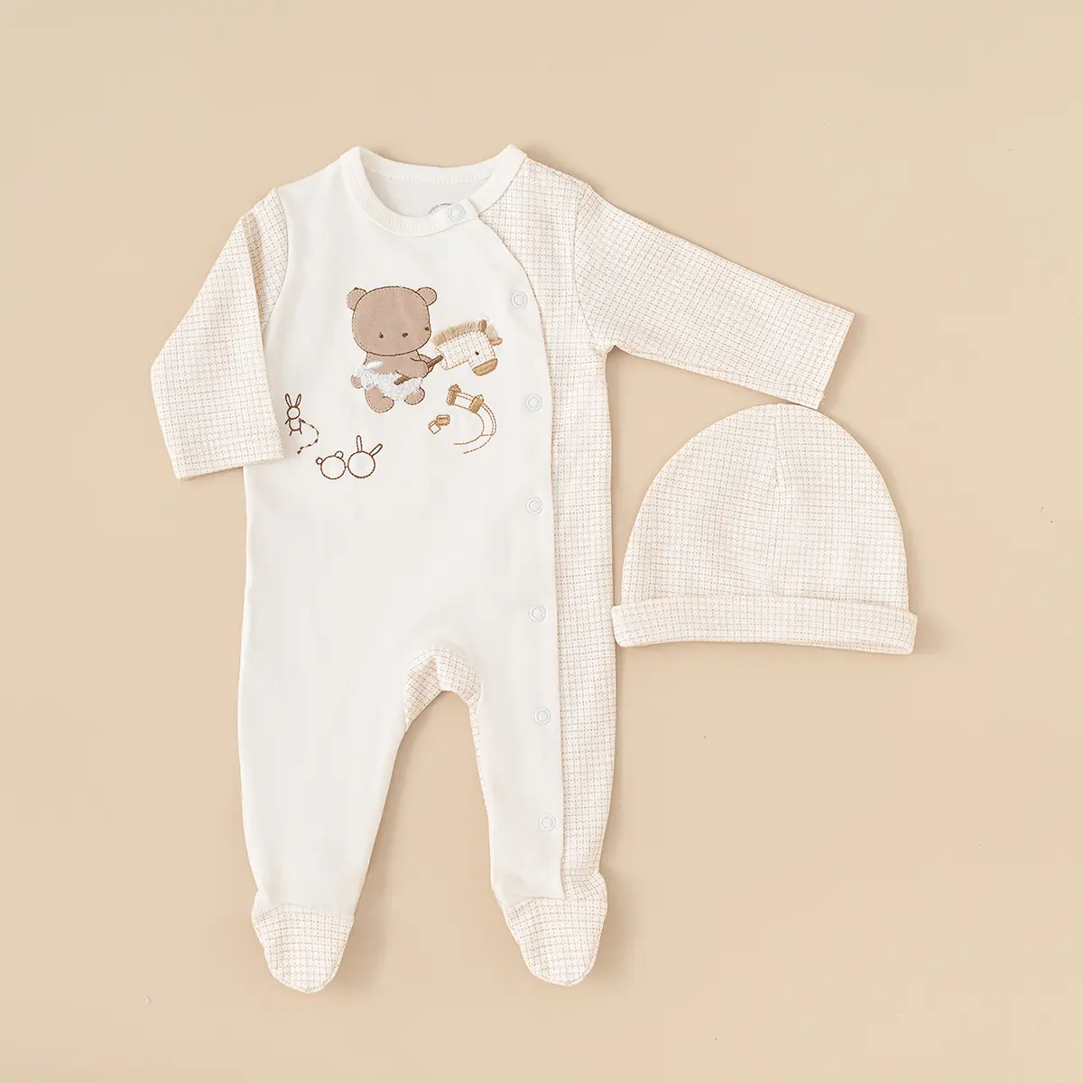 این ست شامل: زیردکمه آستین کوتاه، زیردکمه رکابی، سرهمی جورابدار، مانتو، شلوار، پیشبند، کلاه گرد، یک جفت جوراب، یک جفت دستکش، آروغ گیر، دورپیچ نخی کلاه دار |